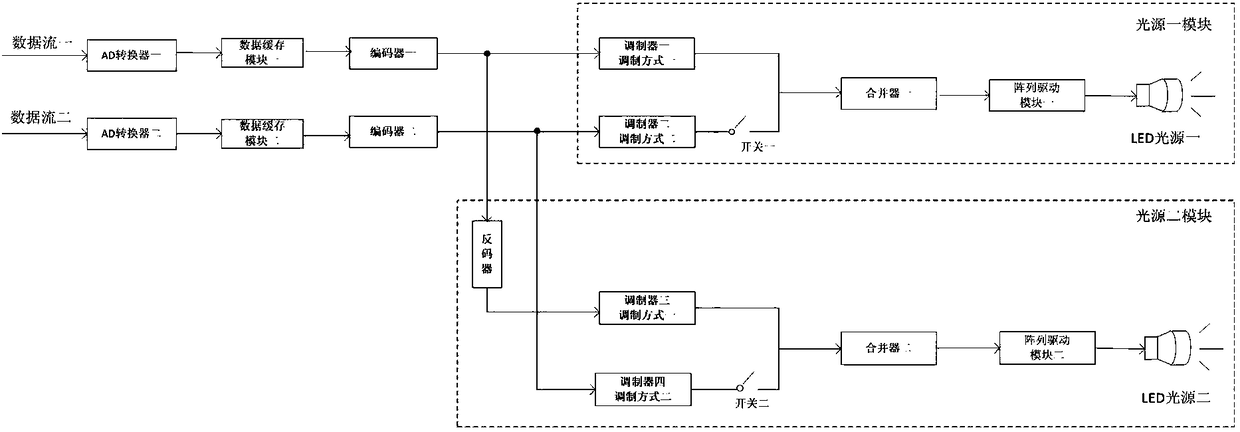 - 项目简介 本发明提供了一种基于LED车灯的双速率可见光通信发信机,其发射端包括AD转换器一、AD转换器二,AD转换器一与数据缓存模块一连接,数据缓存模块一与编码器一连接;AD转换器二与数据缓存模块二连接,数据缓存模块二与编码器二连接;编码器一、二分别连接光源一模块、光源二模块;AD转换器一、二分别将数据流一、二的模拟信号转换成数字信号,再分别经过数据缓存模块一、二进行数据缓存,将缓存后的数字信号流一、二分别送入编码器一、二进行编码。本发明是将经调制器的两种不同调制方式调制后的信号合并,利用调制方式的结合实现两种传输速率信号的发射,从而使得在车联网车与车之间的通信中可以同时传输两路信号,提高了信道利用率。