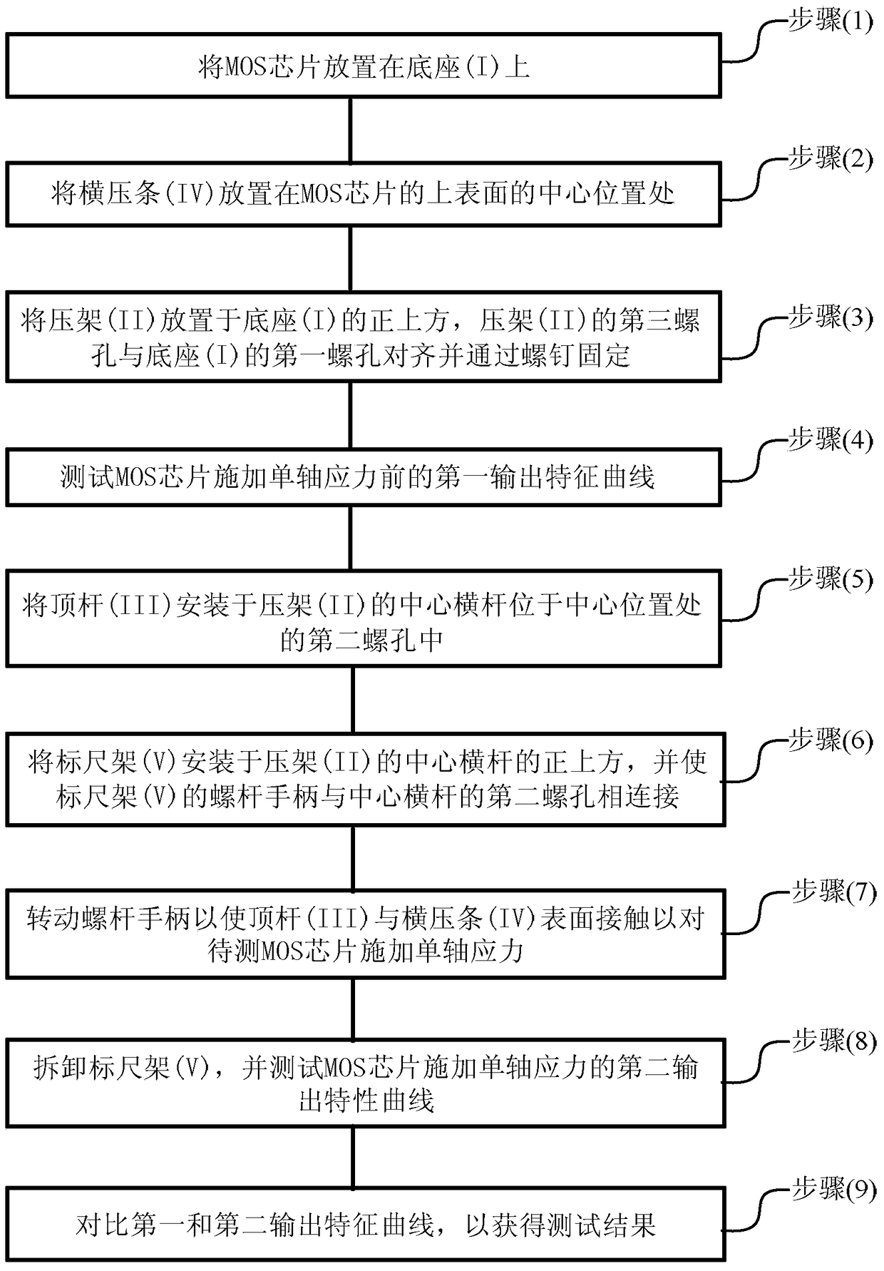 - 项目简介 本发明涉及一种单轴应力施加装置及应变MOS芯片输出特性测试方法,该方法包括:将MOS芯片放置在底座(I)上;将横压条(IV)放置在MOS芯片的上表面的中心位置处;将压架(II)放置于底座(I)的正上方,压架(II)的第三螺孔与底座(I)的第一螺孔对齐并通过螺钉固定;测试MOS芯片施加单轴应力前的第一输出特征曲线;将顶杆(III)安装于压架(II)的中心横杆位于中心位置处的第二螺孔中;将标尺架(V)安装于压架(II)的中心横杆的正上方,并使标尺架(V)的螺杆手柄与中心横杆的第二螺孔相连接;转动螺杆手柄以使顶杆(III)与横压条(IV)表面接触以对待测MOS芯片施加单轴应力;拆卸标尺架(V),并测试MOS芯片施加单轴应力的第二输出特性曲线;对比第一和第二输出特征曲线,以获得测试结果。