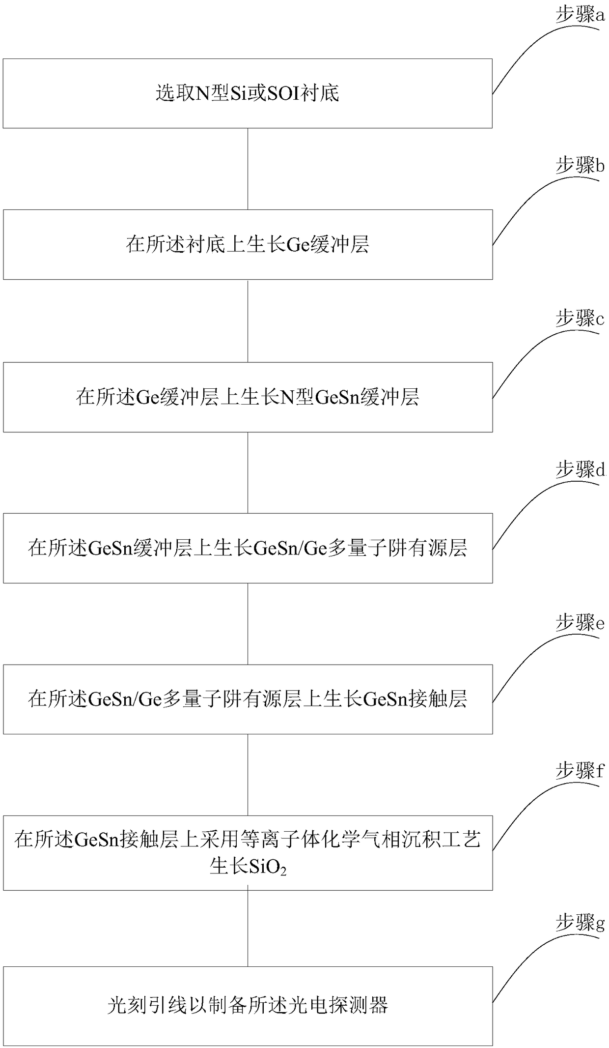 - 项目简介 本发明涉及一种用于长波光通信的光电探测器及其制备方法,其中,所述制备方法包括:选取N型Si或SOI衬底;在所述衬底上生长Ge缓冲层;在所述Ge缓冲层上生长N型GeSn缓冲层;在所述GeSn缓冲层上生长GeSn/Ge多量子阱有源层;在所述GeSn/Ge多量子阱有源层上生长GeSn接触层;在所述GeSn接触层上采用等离子体化学气相沉积工艺生长SiO2;光刻引线以制备所述光电探测器。本发明制备的用于长波光通信的光电探测器测器兼容Si CMOS工艺,克服了暗电流大,低于1800nm连续波段探测问题,高效,且能够在GeSn量子阱中引入不同的应变,调节量子阱的带隙结构以扩展光电探测器的吸收波长范围和吸收系数。