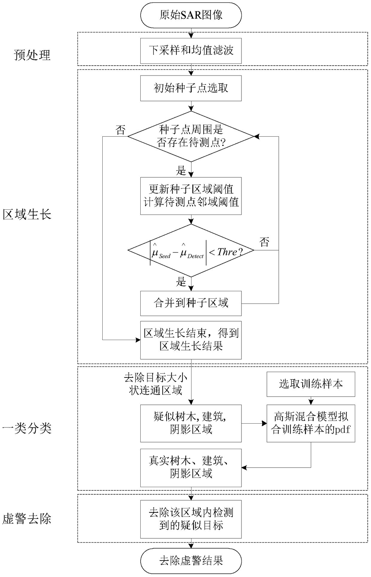 - 项目简介 本发明公开了一种基于先验场景知识的SAR目标检测虚警去除方法,主要解决复杂场景下SAR图像目标检测虚警过多的问题。其实现步骤为:(1)输入原始SAR图像,对原始SAR图像进行两次下采样和均值滤波预处理;(2)对预处理后的SAR图像进行区域生长,去除未生长出的目标大小状的连通区域,剩余的未生长出的连通区域为待分类区域;(3)选取训练样本,对待分类区域进行一类分类,得到不可能存在目标的区域;(4)去除不可能存在目标区域中检测到虚警,得到结果图像。本发明能够有效的减少复杂场景下的检测虚警,可用于对SAR图像目标检测的后处理。