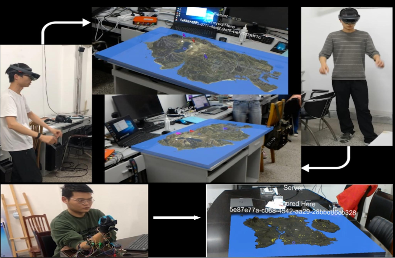 本项目提供一种将混合现实设备与智能人机交互技术结合构建的多人协同沙盘指挥系统。该系统基于微软混合现实眼镜 HoloLens 平台开发而成, 主要功能为多人协同沙盘指挥,可用于灾害救援部署、战场指挥,实现多个用户的实时协作控制,在混合现实中显示模拟沙盘、相关信息以及辅助物品,通过用户的手势、眼动、空间互动等信息,实现人与虚拟场景的交互、人与人之间的交互,实现多人在混合现实环境下协同部署救援物资以及救援结果推演,达到救灾指挥、军事演练的目的。