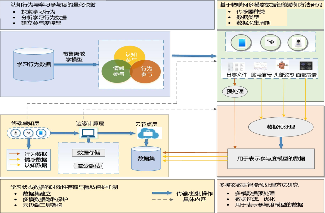 利用智能感知物联网采集实时性的原始学习状态数据,包括面部表情、脑电信号、头部姿态、交互行为等原始数据,这些数据具有数据量大、模态多、冗余度高等特点,需要通过智能化的预处理方法转换成可以量化的状态数据。