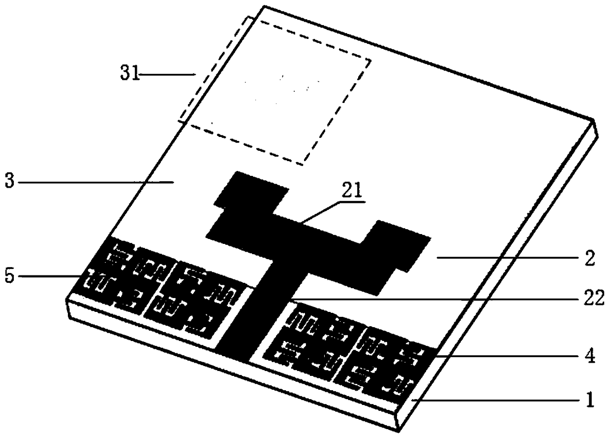 - 项目简介 本发明提出了一种小型双陷波超宽带天线,用于解决现有陷波超宽带天线体积大的问题;包括介质基板(1)、印制在该介质基板(1)上表面下部纵向轴线上的辐射贴片(2)和下表面的地板(3);辐射贴片(2)采用阶跃结构,在其两侧对称设置有蘑菇型EBG结构(4),该蘑菇型EBG结构(4)上蚀刻有曲流弯折缝隙;地板(3)的中间位置设置有宽缝隙,其上部两侧对称蚀刻有四臂螺旋缝隙(31);蘑菇型EBG结构(4)与地板(3)通过金属化过孔(5)连接。本发明具有尺寸小、频带宽且陷波效果好的特点,可用于超宽带无线通信领域中。