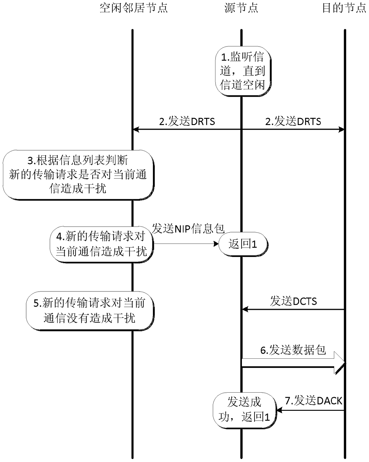 - 项目简介 本发明提供了一种WLAN中空闲节点辅助的定向接入控制方法,内容包括:源节点首先监听信道,待信道空闲后,发送定向请求发送DRTS信息;空闲邻居节点收到DRTS后,根据信息列表判断该DRTS是否对其他节点间的通信造成干扰,若造成干扰,空闲邻居节点向源节点发送邻居信息包NIP,阻塞源节点传输;若没造成干扰,则根据该DRTS更新信息列表中定向网络分配矢量DNAV值,目的节点用接收源节点DRTS方向上的波束向源节点发送定向允许发送DCTS信息,源节点开始发送数据并在收到目的节点的应答后确认传输成功,返回监听状态。本发明避免了由于握手信号漏听引起的隐藏节点问题,增加了并行传输节点的对数,提高了信道利用率。