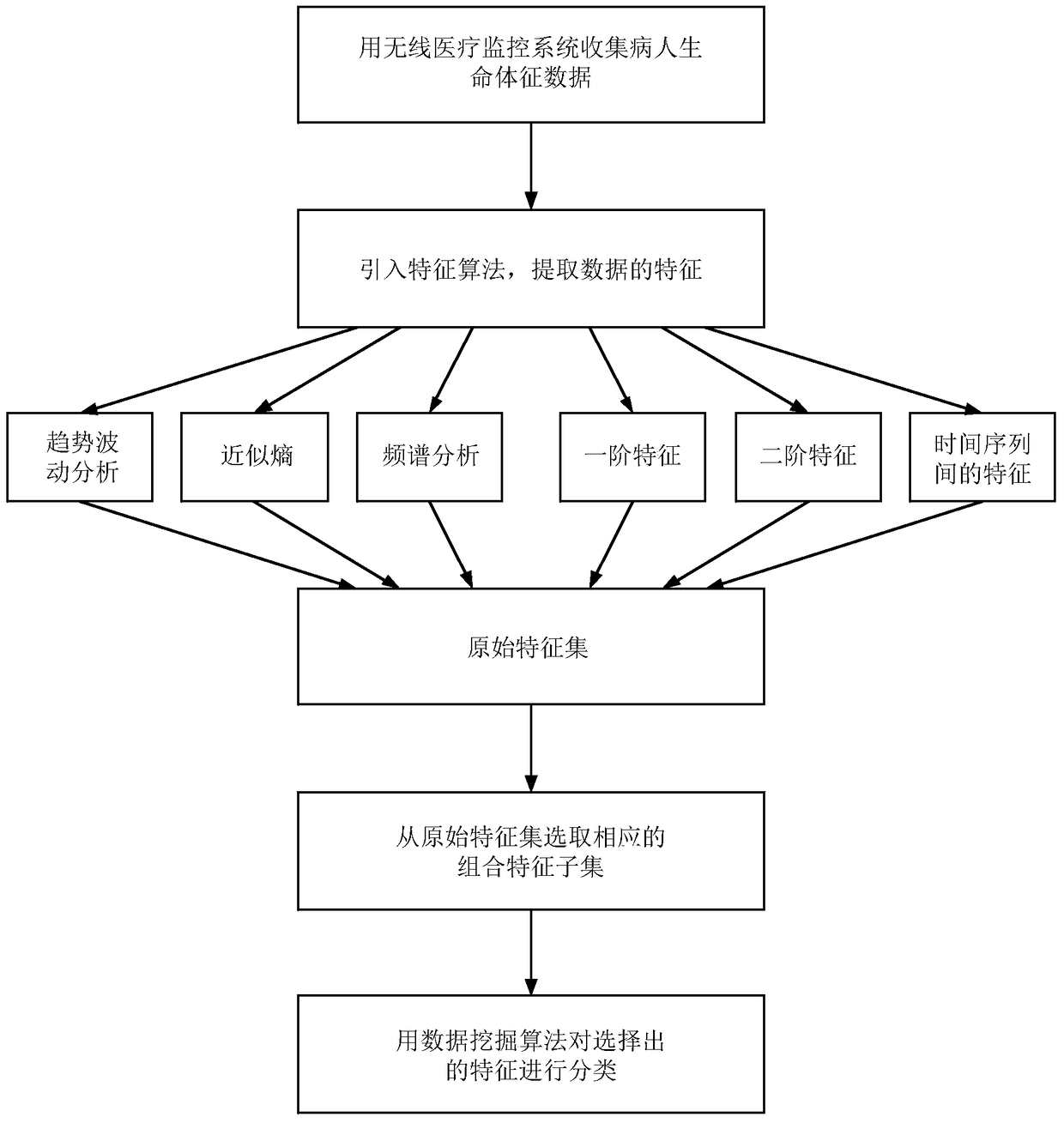 - 项目简介 本发明属于临床数据检测和数据挖掘技术领域,具体涉及是一种基于特征提取算法的数据特征分类方法,包括以下步骤:首先,收集并构建正常人的生命体征数据库N;其次,收集病人的生命体征数据S‑1;然后,从数据库N中选取与收集的病人生命体征数据S‑1相匹配的正常人的生命体征数据N‑1,引入特征提取算法,从病人生命体征数据S‑1的时间特征序列中提取出最有鉴别能力的特征;再次,从提取的全部特征中选取相应的特征子集;最后,用数据挖掘算法将选取的特征子集进行分类。该方法,通过挖掘无线医疗设备检测的实时的、高频率的病人生命体征数据,防止病人临床恶化的同时为出现的死亡提供早期预警,适用性强,提高了工作效率。