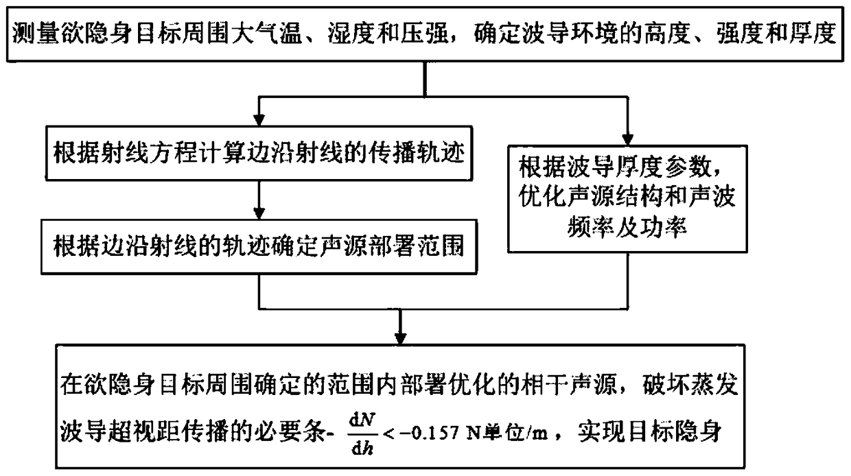 - 项目简介 一种针对海面蒸发波导超视距探测雷达的目标隐身方法,步骤如下:测量欲隐身目标周围环境的大气参数,确定蒸发波导参数;根据射线方程计算蒸发波导中电波射线轨迹;计算可以实现蒸发波导超视距传播的边沿射线跳距,确定波束轨迹跳距,在欲隐身目标周围K倍波束轨迹跳距范围内部署相干声源阵列,通过声波干涉产生的声压分布,改变欲隐身目标周围大气的大气折射指数空间分布结构,使得超视距探测雷达的信号不能有效传播至欲探测目标并返回至探测雷达。本发明利用声波干涉原理,在海面蒸发波导环境中产生特定结构的声压分布,改变蒸发波导特征参数或者破坏蒸发波导结构,使得基于蒸发波导环境的超视距探测雷达系统无法有效探测目标,实现有效隐身。
