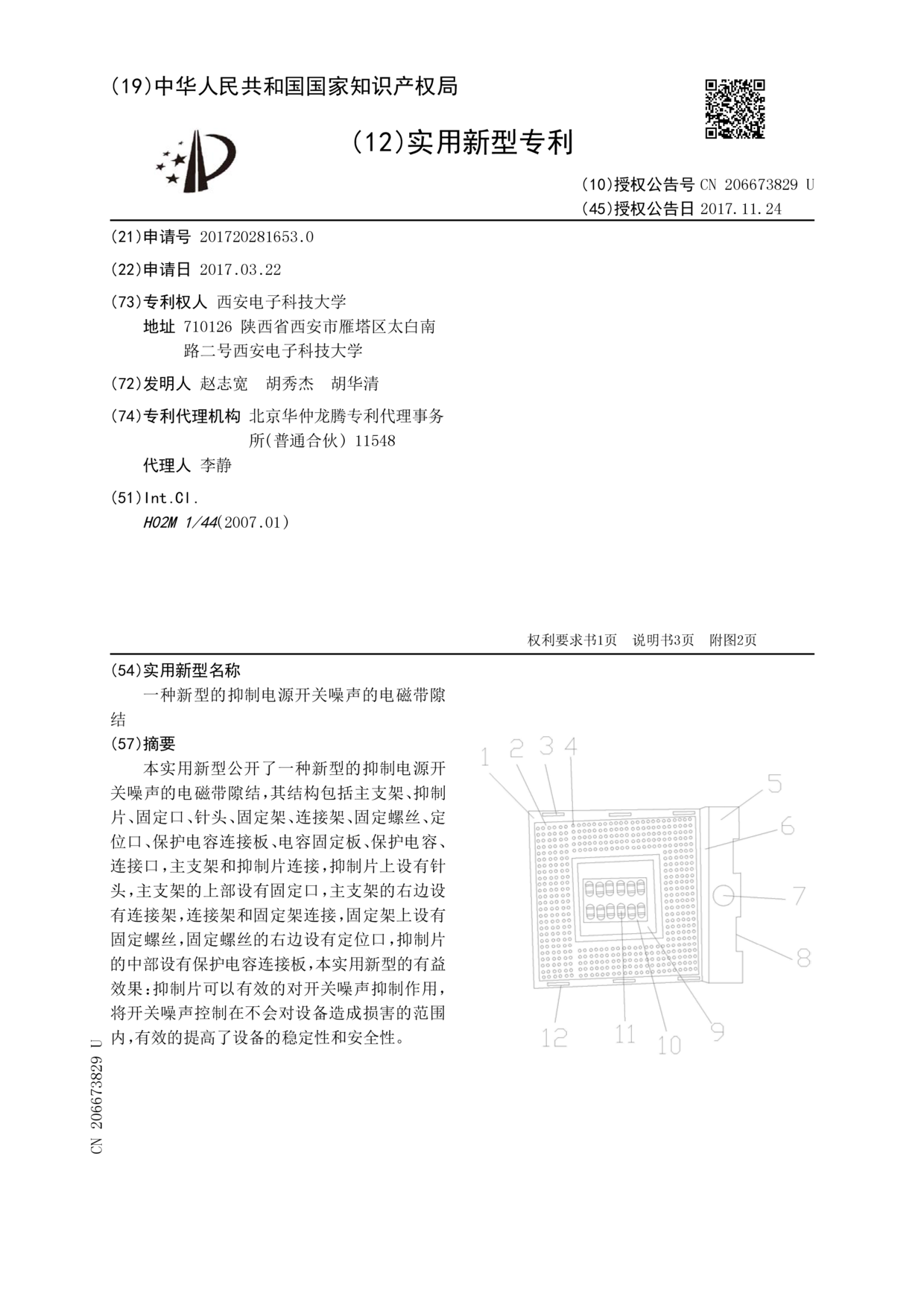 - 项目简介 本实用新型公开了一种新型的抑制电源开关噪声的电磁带隙结,其结构包括主支架、抑制片、固定口、针头、固定架、连接架、固定螺丝、定位口、保护电容连接板、电容固定板、保护电容、连接口,主支架和抑制片连接,抑制片上设有针头,主支架的上部设有固定口,主支架的右边设有连接架,连接架和固定架连接,固定架上设有固定螺丝,固定螺丝的右边设有定位口,抑制片的中部设有保护电容连接板,本实用新型的有益效果:抑制片可以有效的对开关噪声抑制作用,将开关噪声控制在不会对设备造成损害的范围内,有效的提高了设备的稳定性和安全性。