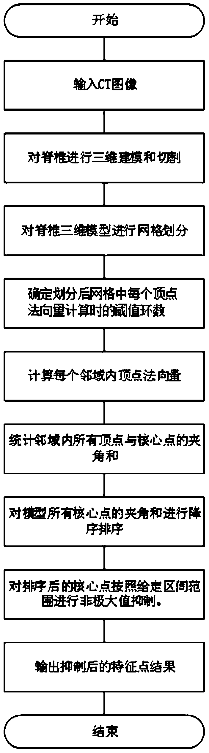 - 项目简介 本发明公开了一种脊椎特征点自动识别方法,属于医学图像处理领域。构建过程为:通过CT图片进行脊椎三维模型建模和切割;获得要进行特征点识别的特定椎体;对椎体进行网格划分,使得椎体由细小的三角面片构成;对椎体模型的每个顶点,自适应计算每个顶点的邻域面积,称该顶点为其邻域内核心点;计算处于邻域面积内部的顶点法向量;计算核心点所处邻域内所有顶点与核心点法向量夹角总和;对所有核心点的夹角和进行降序排序;对所有核心点根据一定抑制区间进行非极大值抑制;最后获得该椎体的特征点。本发明主要是针对脊椎特定的外形结构进行特征点识别方法。可用于外科医学领域中与脊椎相关的研究。