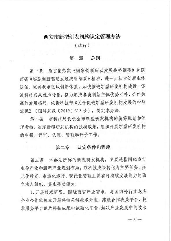 为贯彻落实《国家创新驱动发展战略纲要》和陕西省《实施创新驱动发展战略纲要》精神,加快新型研发机构建设,促进科技成果就地转化,依据科技部《关于促进新型研发机构发展的指导意见》(国科发政〔2019〕313号),市科技局研究制定了《西安市新型研发机构认定管理办法(试行)》,现予以印发执行。